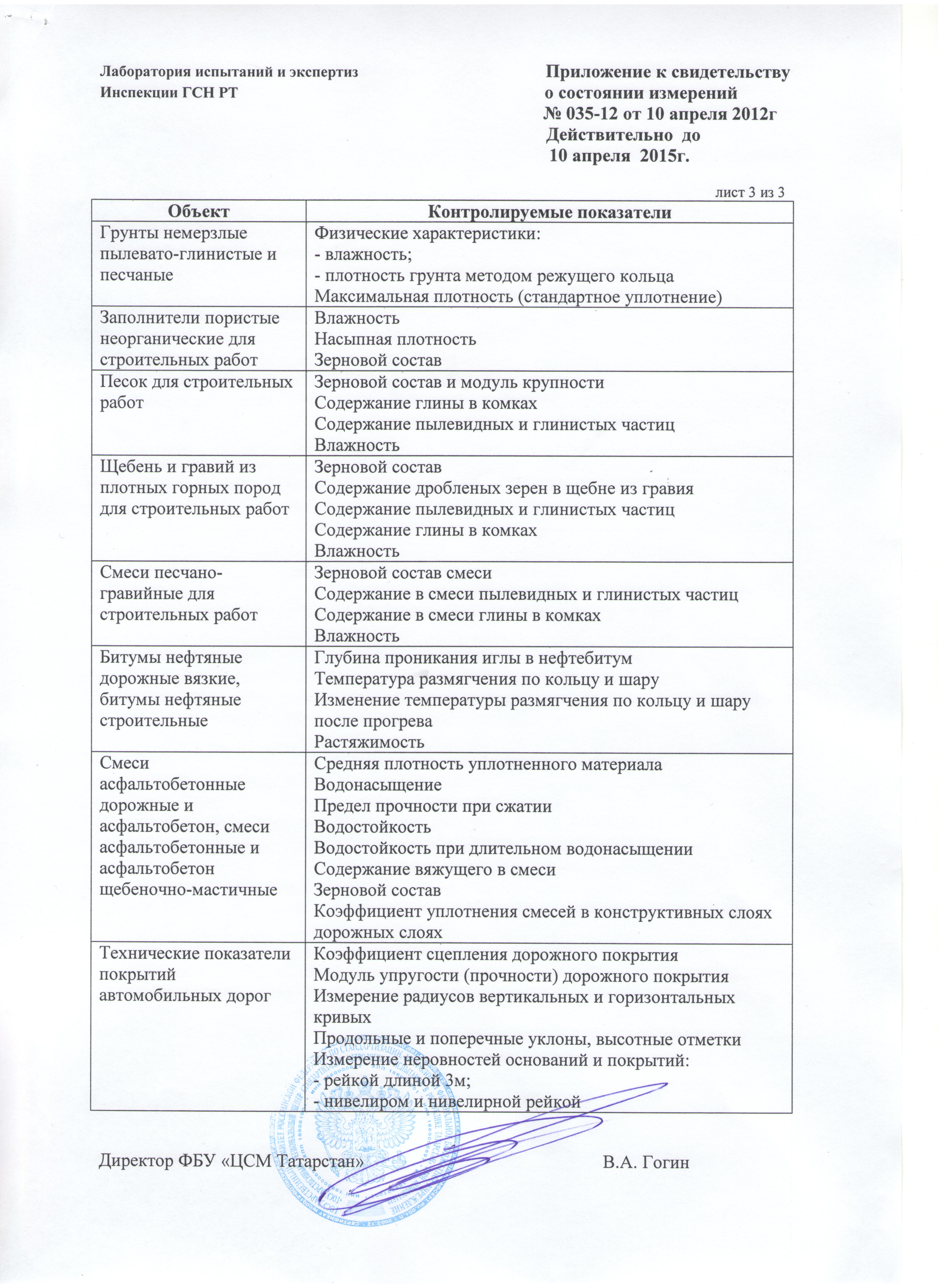 Комиссия по аттестации лаборатории проанализировала состояние испытаний смесей бетонных, бетона тяжелого, мелкозернистого, ячеистого, изделий и конструкций железобетонных, блоков из ячеистого бетона, раствора строительного, материалов металлических, сварных соединений металлоконструкций, кирпича и камней керамических и силикатных, камней бетонных стеновых, конструкций строительных стеновых, цемента, заполнителей пористых неорганических, заполнителей из плотных горных пород, смесей песчано-гравийных для строительных работ, плит пенополистирольных, блоков оконных и дверных, грунтов, битумов нефтяных дорожных вязких и строительных, смесей асфальтобетонных дорожных, смесей асфальтобетонных щебеночно-мастичных, покрытий автомобильных дорог по показателям формы 1 Паспорта лаборатории.