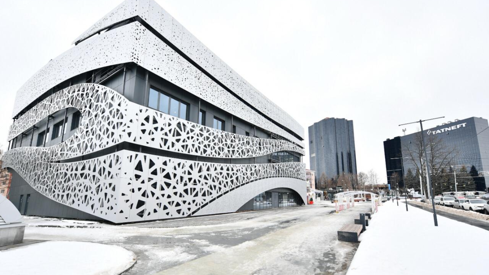 Здание расположилось в центре города. Его стены украшает перфорированный навесной фасад, который напоминает о геологии региона - стилизация последовательности нефтеносных пластов Альметьевского выступа.