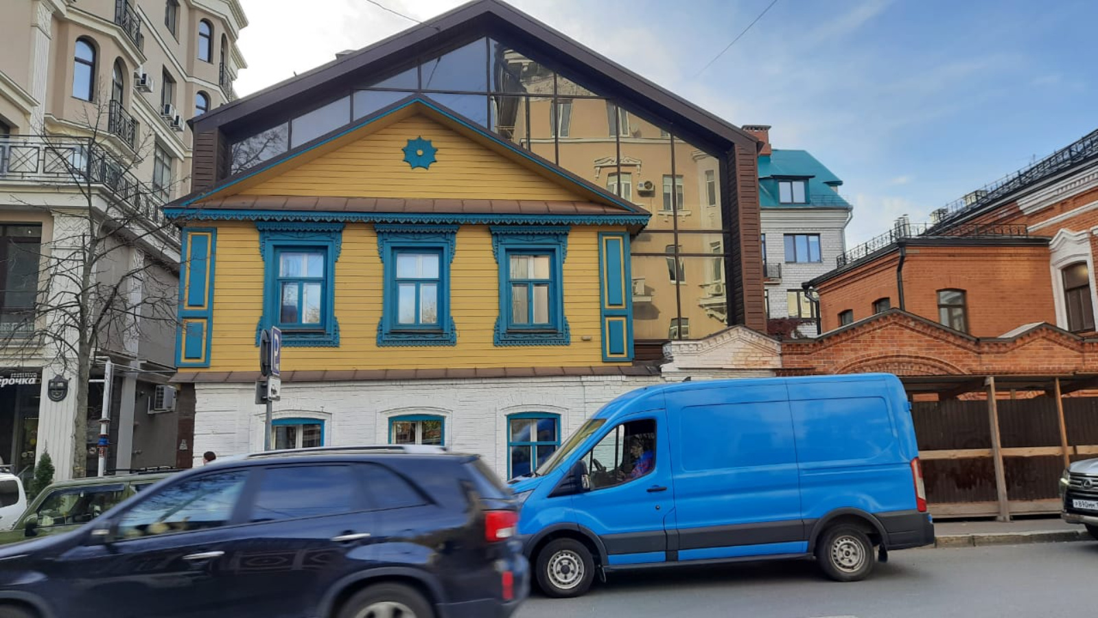 К нему пристроена основная часть здания, выполненная в современном стиле. К объекту также примыкают кирпичные подлинные ворота с калиткой.