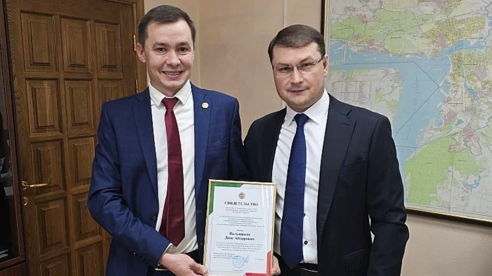 На фото: начальник Инспекции государственного строительного надзора Республики Татарстан Вали Назмеев вручает Диасу Вальщикову свидетельство и поздравляет его с заслуженной наградой.