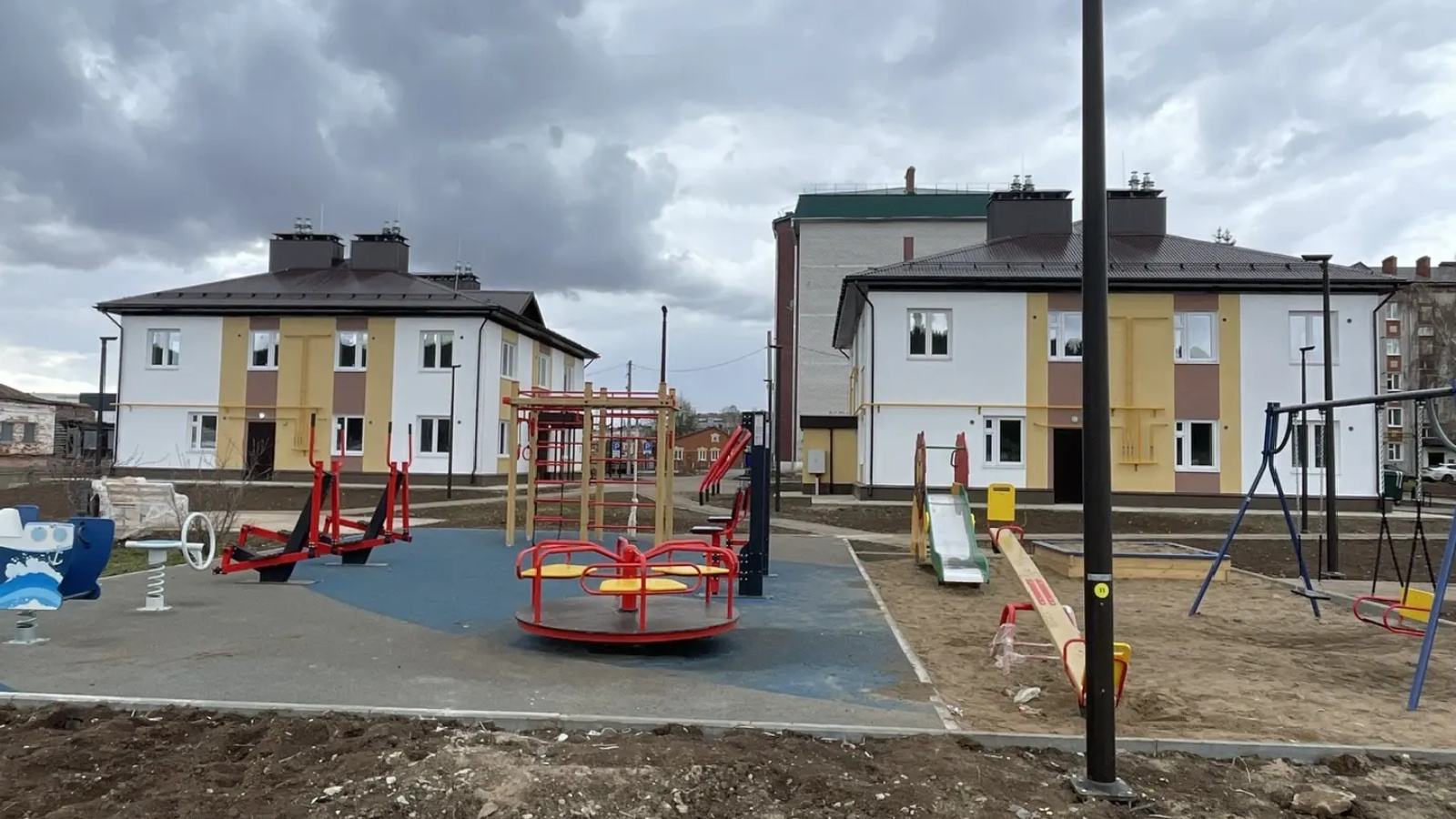 Для будущих жильцов построено 16 квартир. В каждом двухэтажном доме – по 8 квартир общей площадью около 140 кв. метров. Придомовая территория благоустроена и освещена, оборудована детской площадкой.