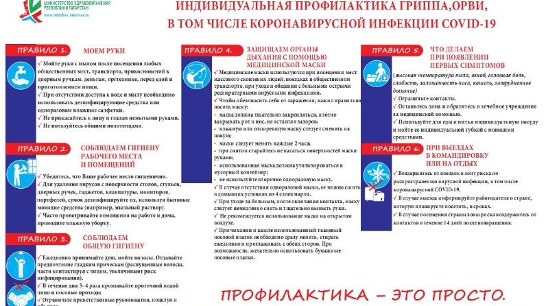 Министрлык белешмәсендә алты төп кагыйдә бар: кулларны сабын белән юарга, эш урынында һәм гомуми гигиенаны үтәргә, сулыш органнарын медицина битлеге ярдәмендә якларга, авыруның беренче билгеләре барлыкка килү белән табибка мөрәҗәгать итәргә һәм коронавирус инфекциясе таралу куркынычы зонасында булган илләргә барудан тыелып торырга.