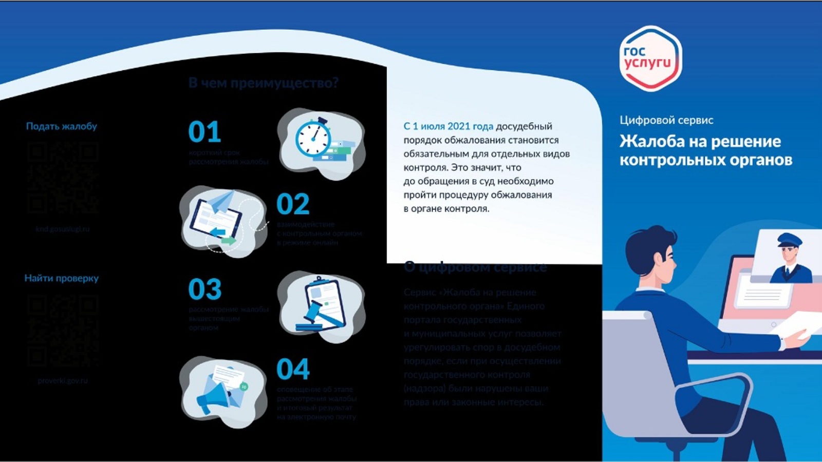 Дәүләт һәм муниципаль хезмәтләр күрсәтүнең бердәм порталында «Контрольлек органнары карарына шикаять» сервисы, дәүләт контролен (күзәтчелеген) гамәлгә ашырганда хокукларыгыз яки законлы мәнфәгатьләрегез бозылган очракта, бәхәсләрне судка кадәрге тәртиптә җайга салырга мөмкинлек бирә.