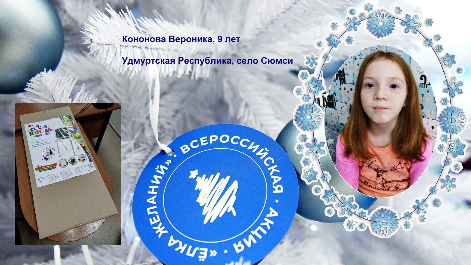 Вероникага – тугыз яшь, әнисе Татьяна Вячеславовна сүзләренә караганда, кыз бик тә рәсем ясарга ярата. Ул өченче математика сыйныфында укый. Укудан соң атнага берничә тапкыр, өч яшьтән бирле инде, сәнгать мәктәбенә йөри икән. «Без гаиләдә биш кеше. Мин хәзер өченче балабызны карау ялында, – дип сөйли Татьяна Вячеславовна, – ә моңа кадәр Росгосстрахта эшләгән идем. Артёмга тиздән бер яшь тула. Олысы Тимофейга – өч яшь. Балаларның әтисе пилорамда эшли. Кызым бик тә мольберт теләде. Ә тагын ул пластилиннан сыннар ясарга ярата. Әйтерсең лә, сез аның яраткан шөгыле турында белеп торгансыз. Верониканың хыялын чынга ашырганыгыз өчен рәхмәт сезгә!»